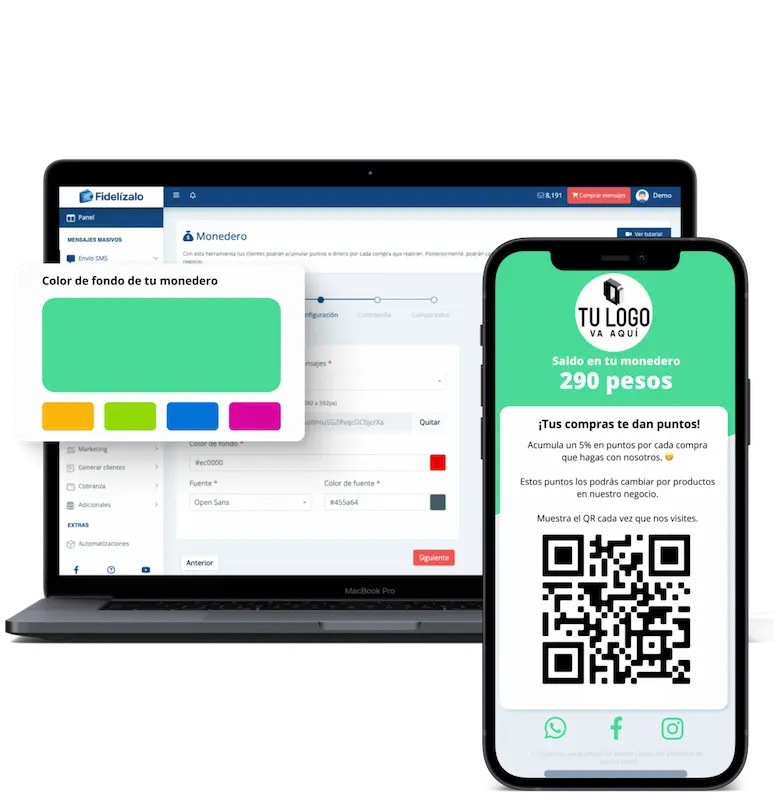Tú decides el porcentaje, la compra mínima, si expiran los puntos, subimos tu logotipo, colores y tienes listo un monedero personalizado.